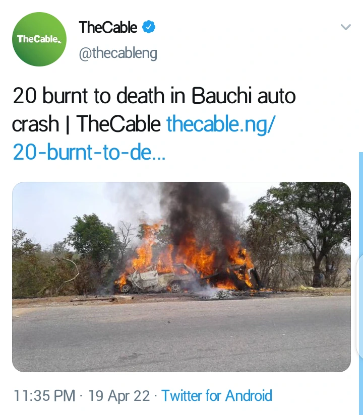 The Federal Road Safety Corps (FRSC), Bauchi command, says 20 people were killed in an auto crash which occurred in Ganjuwa LGA of the state on Tuesday.