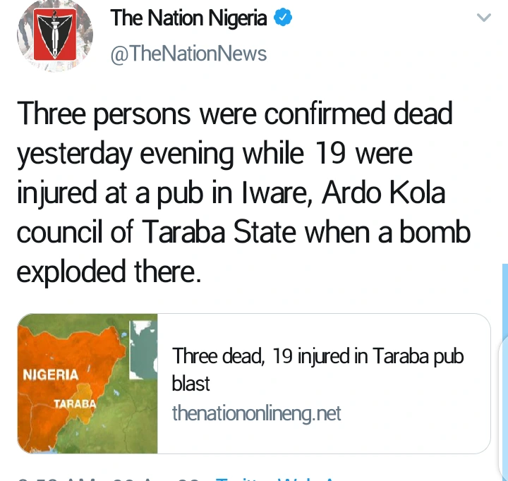 Three persons were confirmed dead yesterday evening while 19 were injured at a pub in Iware, Ardo Kola council of Taraba State when a bomb exploded there.