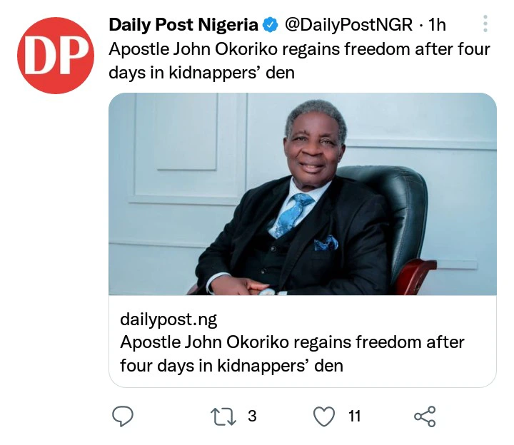 Apostle John Okoriko regains freedom from Kidnapper's den