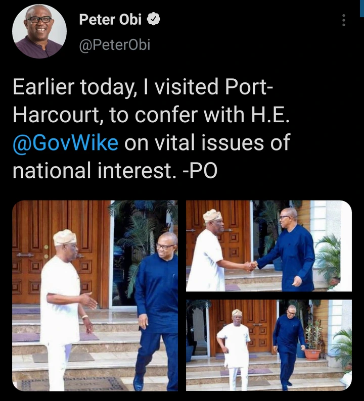 In a statement released by Peter Obi via his twitter handle, Peter Obi revealed that he visited Gov. Nyesom Wike today at Port Harcourt, to confer with him on vital issues of national interest.