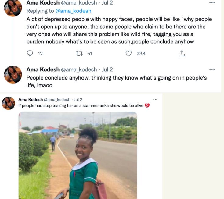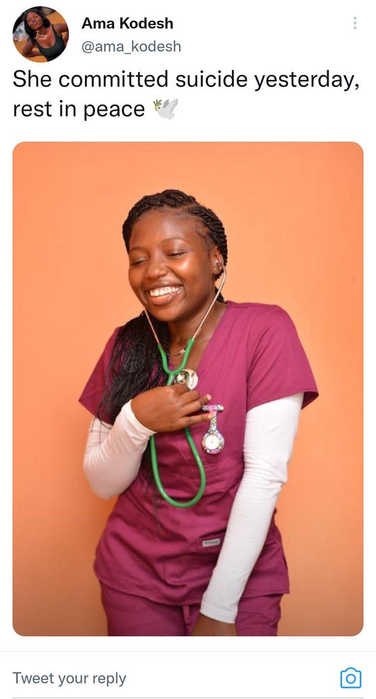 According to @ama_kodesh, the beautiful nurse decided to end it all after her friends mocked her for being a stammerer.